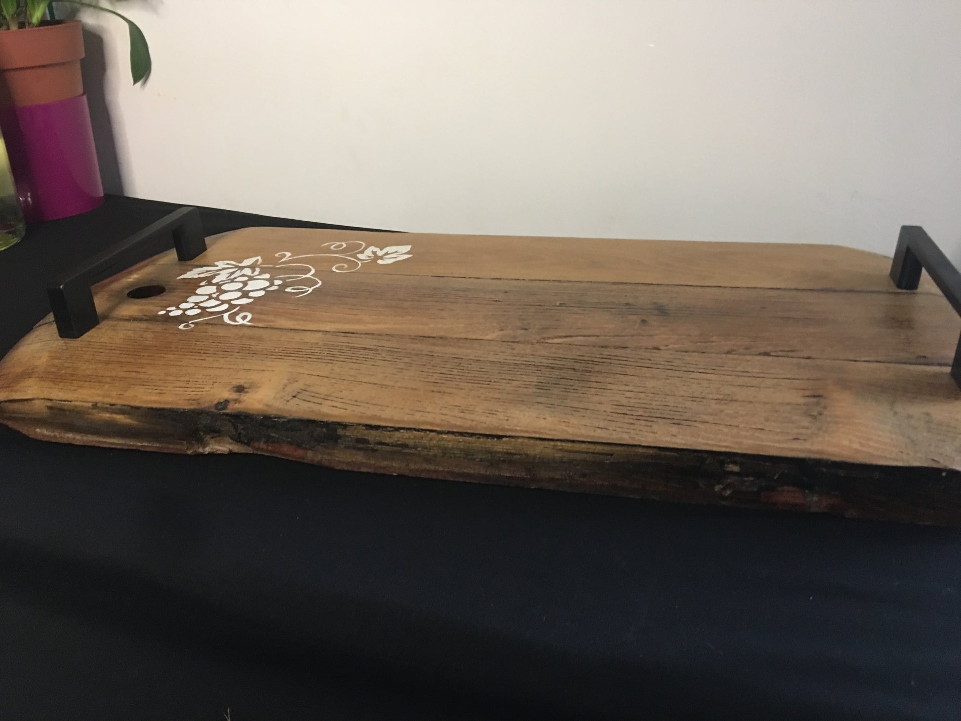 Avec ses deux poignées noires intégrées de chaque côté, le plateau est pratique à transporter tout en offrant un contraste élégant avec la couleur naturelle du bois. Le design s’accompagne également d'un pochoir en feuille de vigne et grappe de raisin, qui évoque la convivialité, le partage et la tradition des repas en plein air.